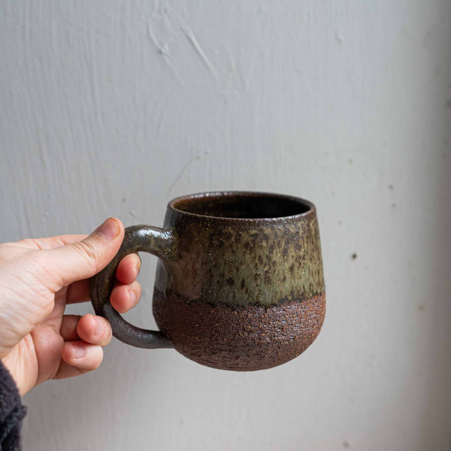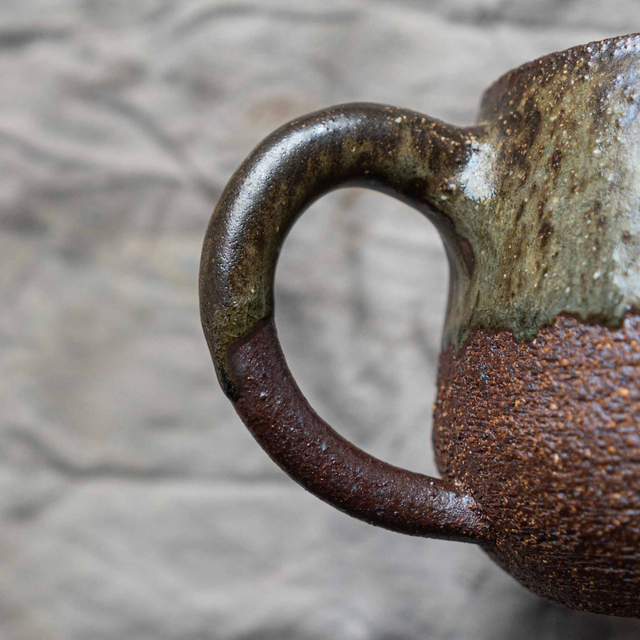 Woodfired mug with a very tactile gritty and toasted texture.
